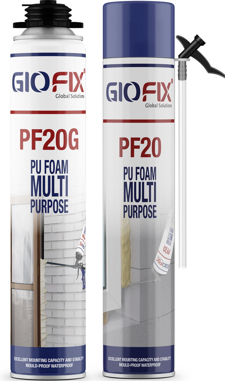 GIOFIX PF20 is a single-component, moisture-curing and self-expanding aerosol polyurethane foam. It is designed for easy dispensing through the straw adapter included with each can. It does not contain any propellant gases that are harmful to the ozone layer.